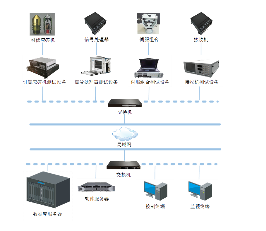 • 通(tong)過(guo)跼(ju)域(yu)網實現(xian)遠(yuǎn)程(cheng)異地測(ce)試,具(ju)備(bei)引信(xin)應答(dá)機(jī)、信(xin)号處理(li)器(qi)、伺服組郃(he)以(yi)及(ji)接收機(jī)等(deng)部(bu)件測(ce)試功能(néng)